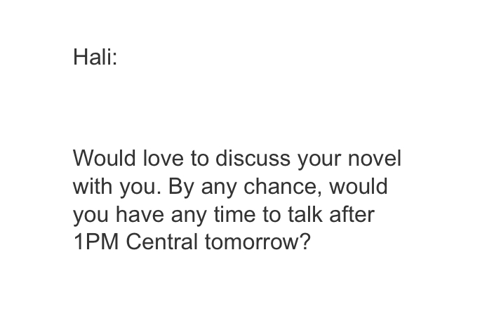 I scheduled the call for that Friday (I worked 8 hours every single day that week except for Friday), and it was the longest fucking week of my life. I couldn’t sleep a wink until Wednesday. If you know me, you know I’m a narcissistic shithead, which means you know how crazy I must have been going to be doubting myself by the time Thursday night rolled around. So many questions were bouncing around inside my skull: what if this was a request for an R&R? What if this agent spoke to me and decided we weren’t a good fit? What if I had another bad experience like I did with the small press?