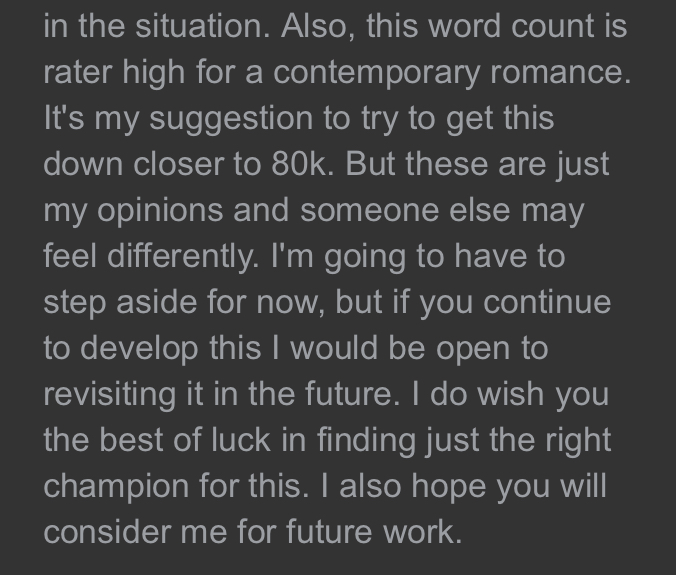You can tell this is personalized because they mentioned the length of the manuscript specifically (the manuscript I queried was 98k words which, admittedly, is quite long for an Adult Romance). But this personalization is short, succinct, and kind without making suggestions for changes that might hurt the manuscript.