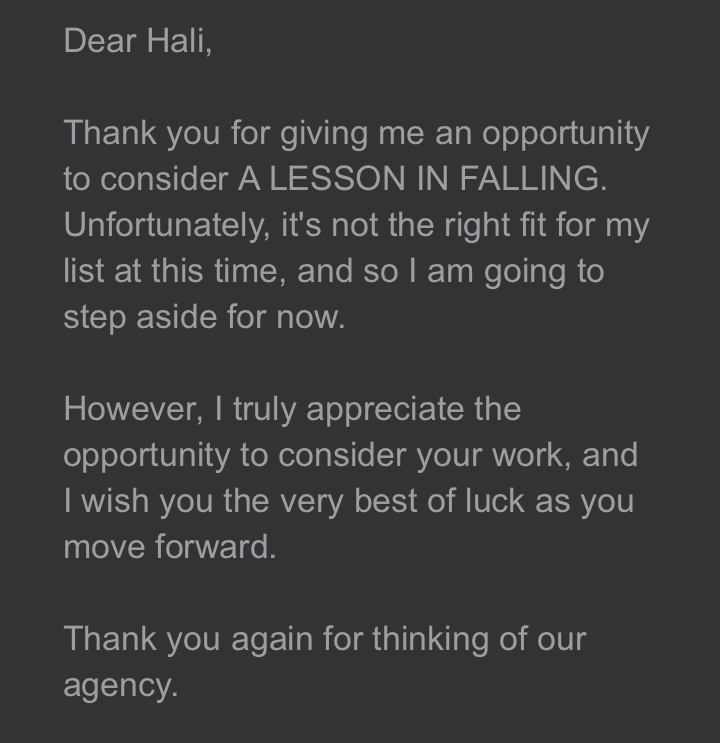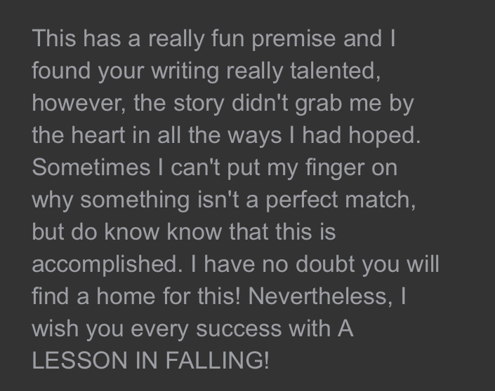 This was from an editor at a small press I had submitted to just two weeks before in my desperation. Around the end of June, with so many unanswered full and partial requests that I felt wouldn’t amount to anything, I admittedly began to panic that I wasn’t going to find a home for A LESSON IN FALLING. So, I did what any querying writer would do and sent panic queries. So. Many. Panic queries.