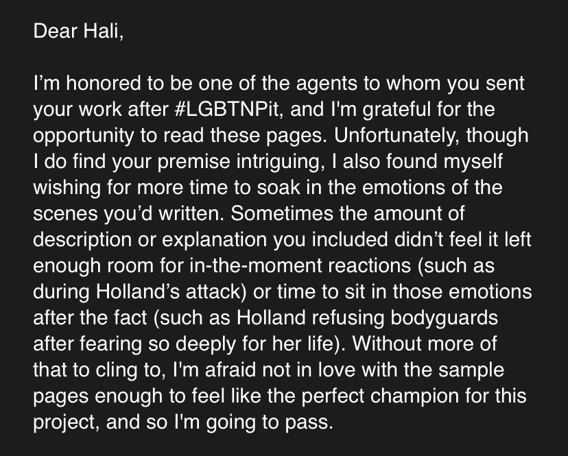 Here is a rejection I received from an agent after they liked my Tweet during #LGBTNPit: