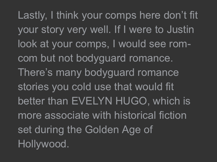 The aspect of THE SEVEN HUSBANDS OF EVELYN HUGO that I comped to in my query letter was the all-encompassing sapphic romance between world-famous celebrities, and this was the only time I received a rejection critiquing the use of it. Further, it was suggested that I comp a bodyguard romance instead, but…I did. TWISTED GAMES, the second book in the Twisted series by Ana Huang (an Adult Contemporary Romance between a princess and her bodyguard) was my other comp title.