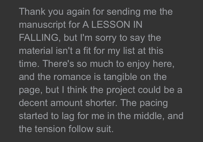Almost indiscernible from a query rejection. But no, this is in fact a full manuscript rejection I received about a month and a half after the agent originally requested to see it.